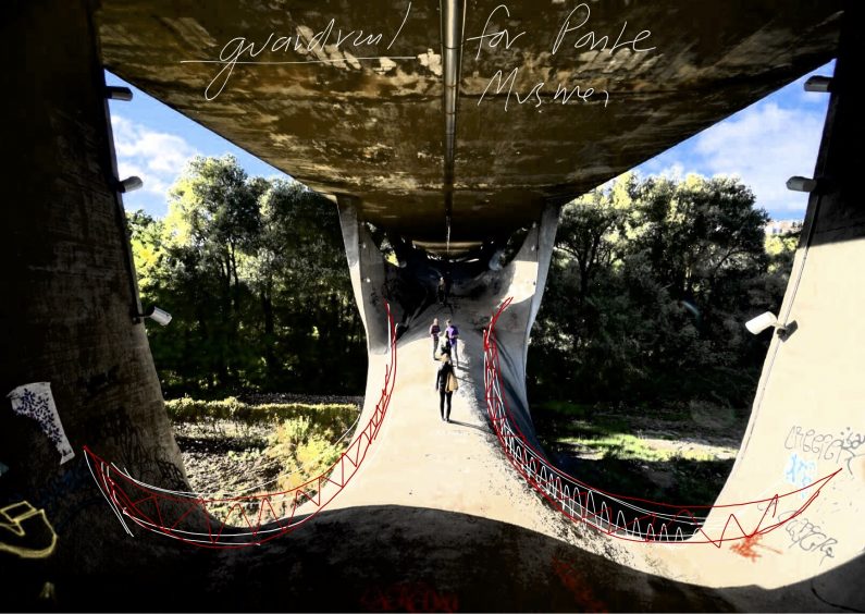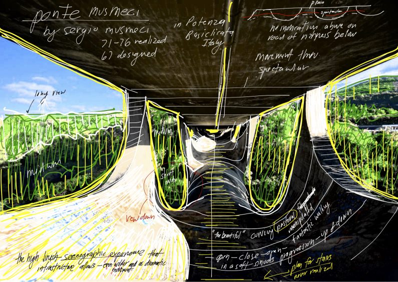 The Arching Path was inspired by a visit to the Ponte Sul Basento (Bridge over the Basento River), a bridge in the southern Italian city of Potenza. It is often called the Ponte Musmeci, named after its designer, the engineer Sergio Musmeci. While visiting Potenza, I was struck by this beautiful and hulking modernist mass—with its curving lines and concrete structure—that stood out from so much older, historical, and ornamented architecture in Italy.